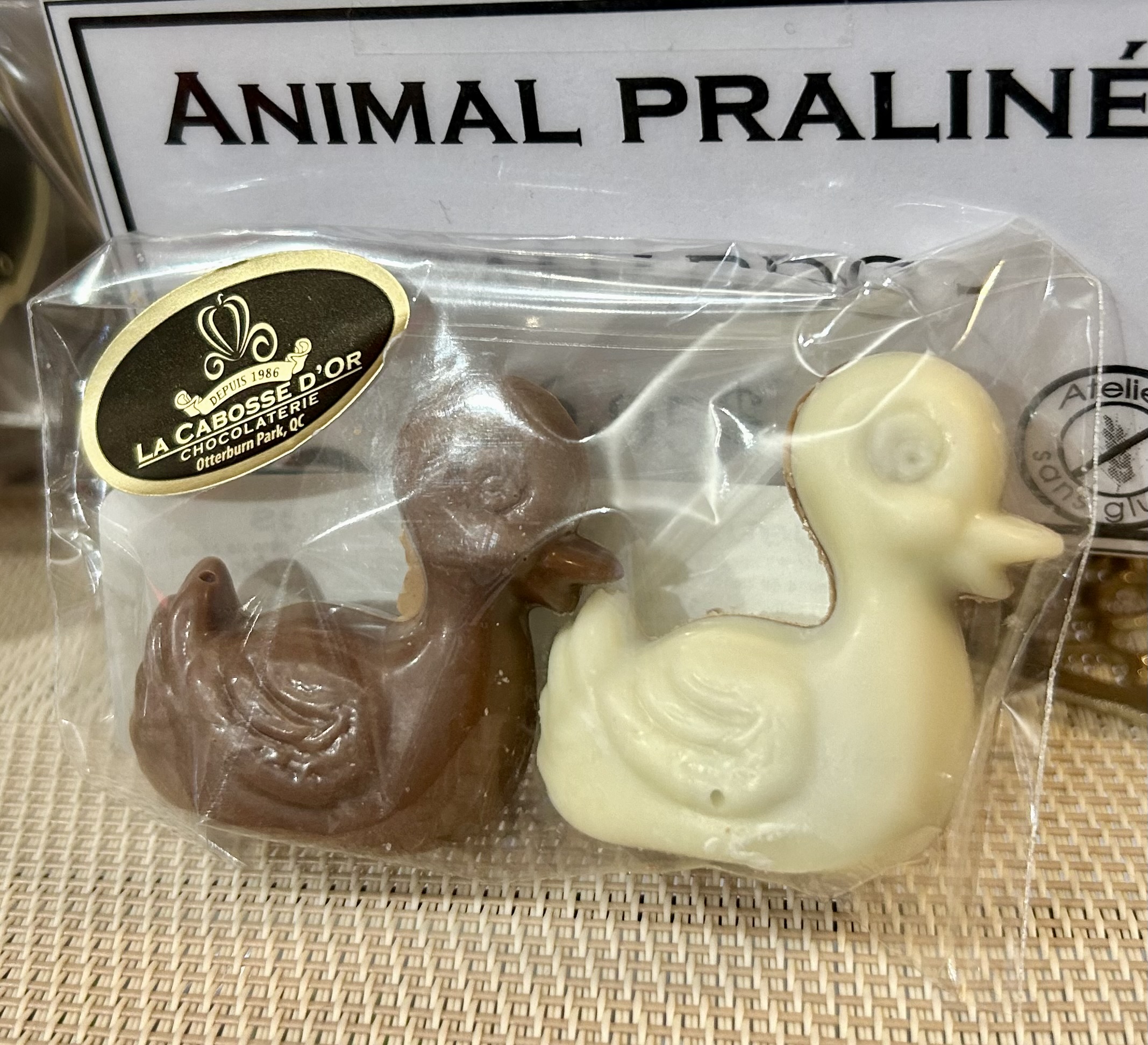 2 canards en chocolat (1 au lait, 1 blanc) remplis de pralinés aux noisettes