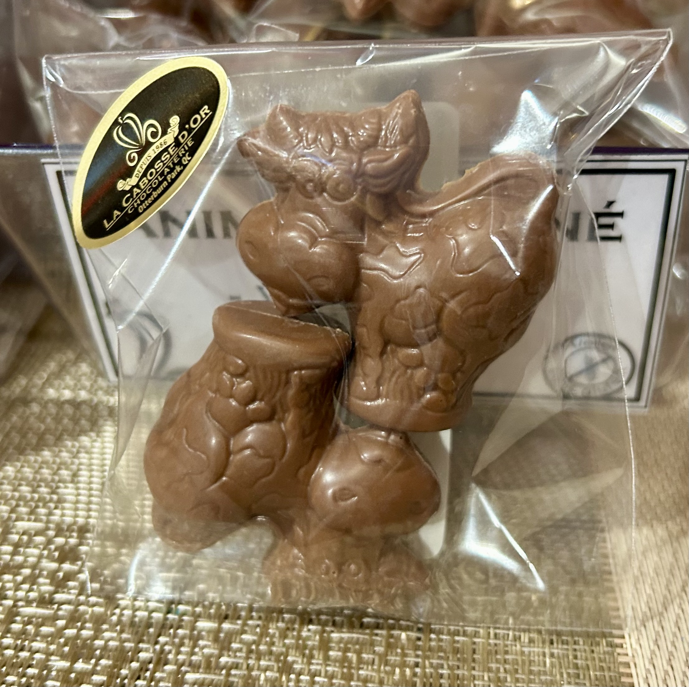 2 vaches en chocolat au lait, remplies de pralinés aux noisettes