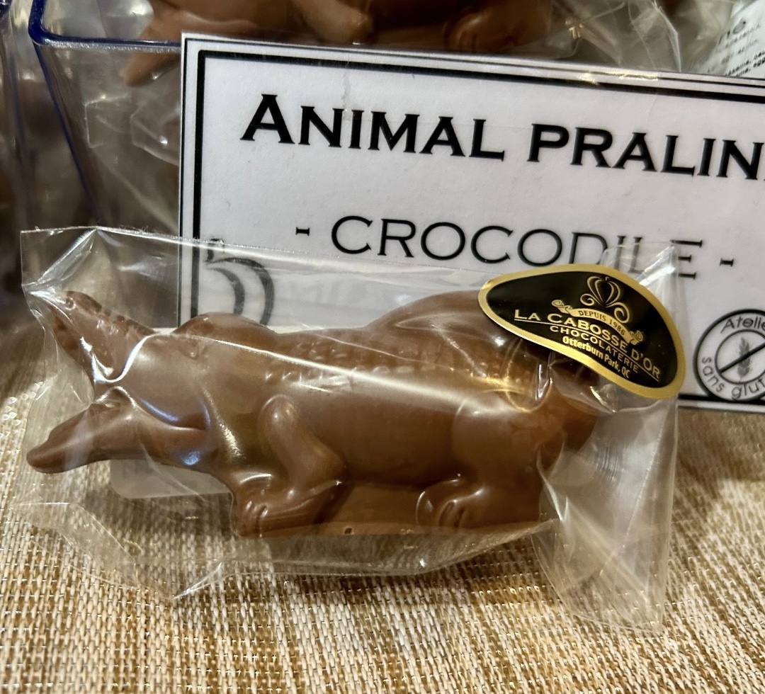Crocodile chocolat au lait, rempli de pralinés aux noisettes (34g).