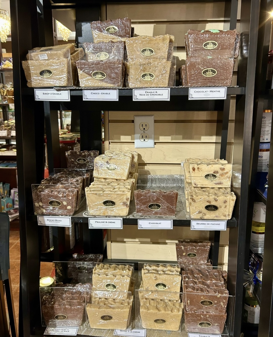 Choco-Érable, Sirop d’érable, Chocolat, Chocolat & Noix de Grenoble, Choco Menthe, Sucre à la crème, Chocolat-Caramel salé, Praliné & Crème, Rocky Road (guimauve, amande), Beurre de pacane.