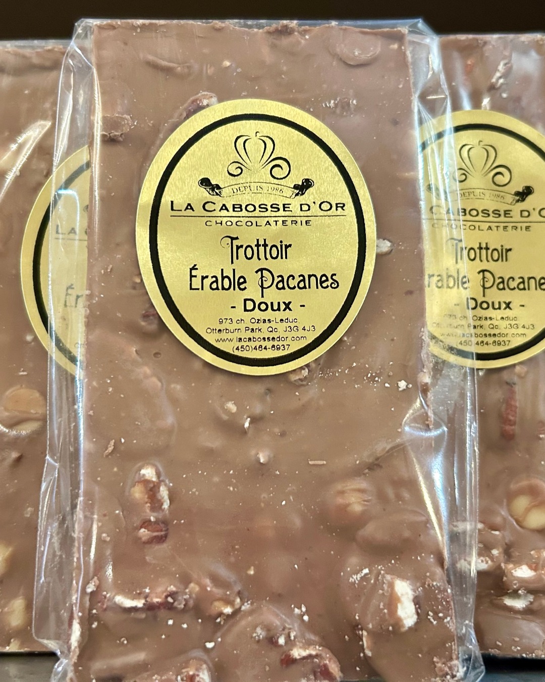 Plaque de chocolat doux à l’érable mélangé à des morceaux de pacanes grillées.